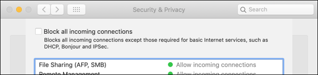 The "Block All Incoming Connections" checkbox in the "Security & Privacy" pane.