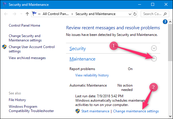In the Security and Maintenance window, expand the ;Maintenance; section, and then click the ;Change maintenance settings; link.