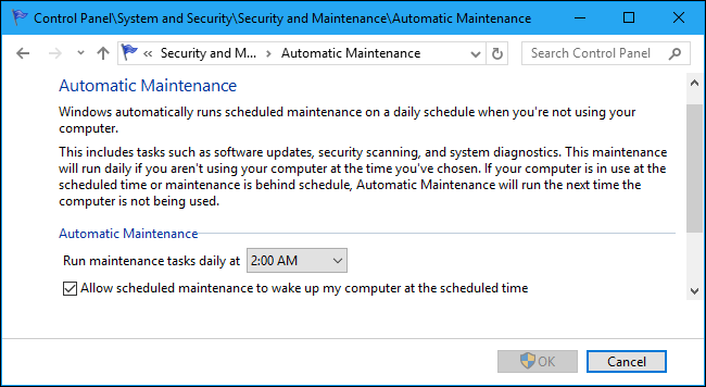 You can7;t turn this automatic maintenance off, but you can change when it operates, and whether or not it can wake a sleeping PC to run its tasks. By default, Windows runs these tasks every day at 2 AM and wakes up your PC to do so if necessary.