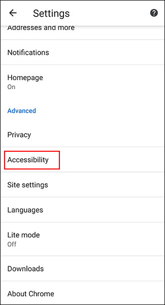 In the ;Settings; menu, scroll down and tap ;Accessibility; to enter Chrome7;s accessibilities menu.