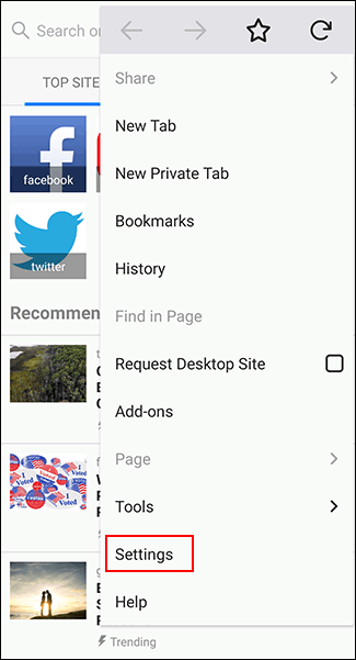 From the dropdown, tap ;Settings; to enter the Firefox settings menu.